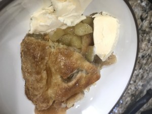 Today I made my first-ever pie using my mom’s recipe! She’s the queen of pie-crust perfection and I’m delighted that my first attempt turned out so wonderfully. She laid out instructions in a step-by-step on Facebook for me with pictures the whole way. So, I went in confidently and wasn’t disappointed! I made the crust on Friday and rolled it out and filled it on Saturday. The end product did have a slightly ‘soggy bottom’ so I don’t think I’d have won any Great British Baking Show prizes but it didn’t last a full three days in my two-person household even so. And, I think draining the apples a little better next time will take care of that trouble. I’m damn proud of this pie and am definitely excited to try and make another one. Strawberry-rhubarb perhaps?