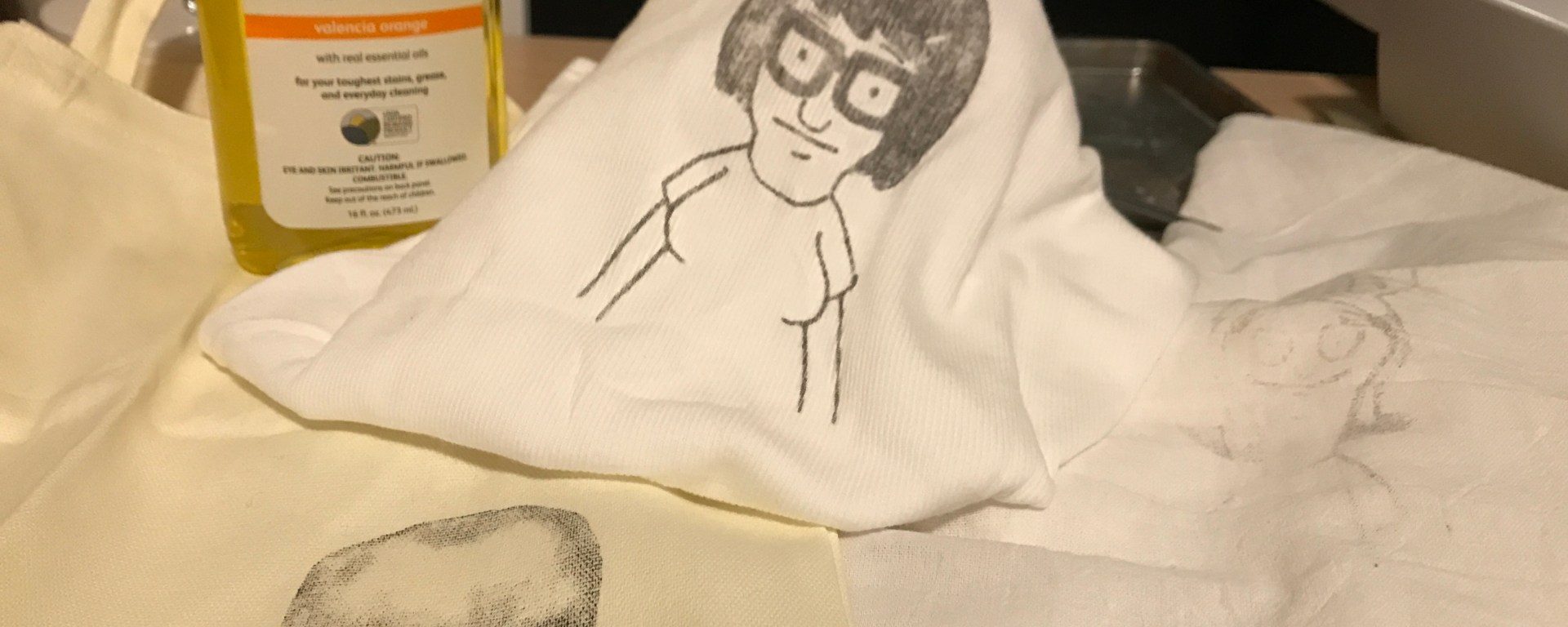 You put the paper face-down on the fabric, paint the back of the paper with citra solv, let it sit for a lil bit, and then rub the back real hard with a spoon. On Louise, I used the back of the spoon and I don’t think I was able to get enough pressure. Next I tried out a cheap-o tote bag and did a TMBG homage image: