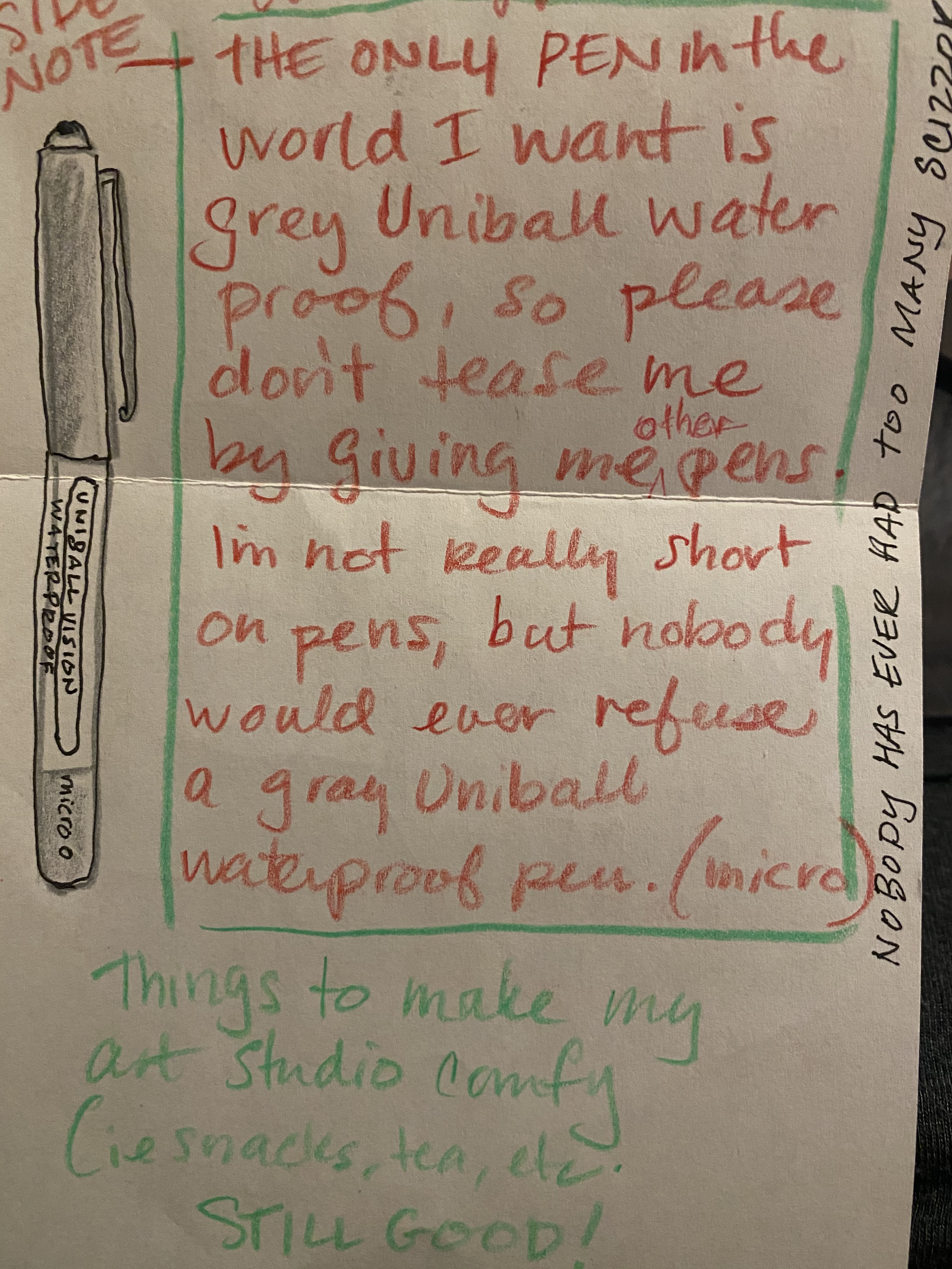 She asked Santa for her dearest wishes: tiny houses, doll stuff, pretend shoes, Things that are fun to do: (pre-read nice happy books, movie suggestions, art like smallish drawings or cut-out things, anything that someone drew or cut out!), Things that are useful: (washi tape, binder clips, white black or dark brown prismacolor pencils, other not-crappy things).